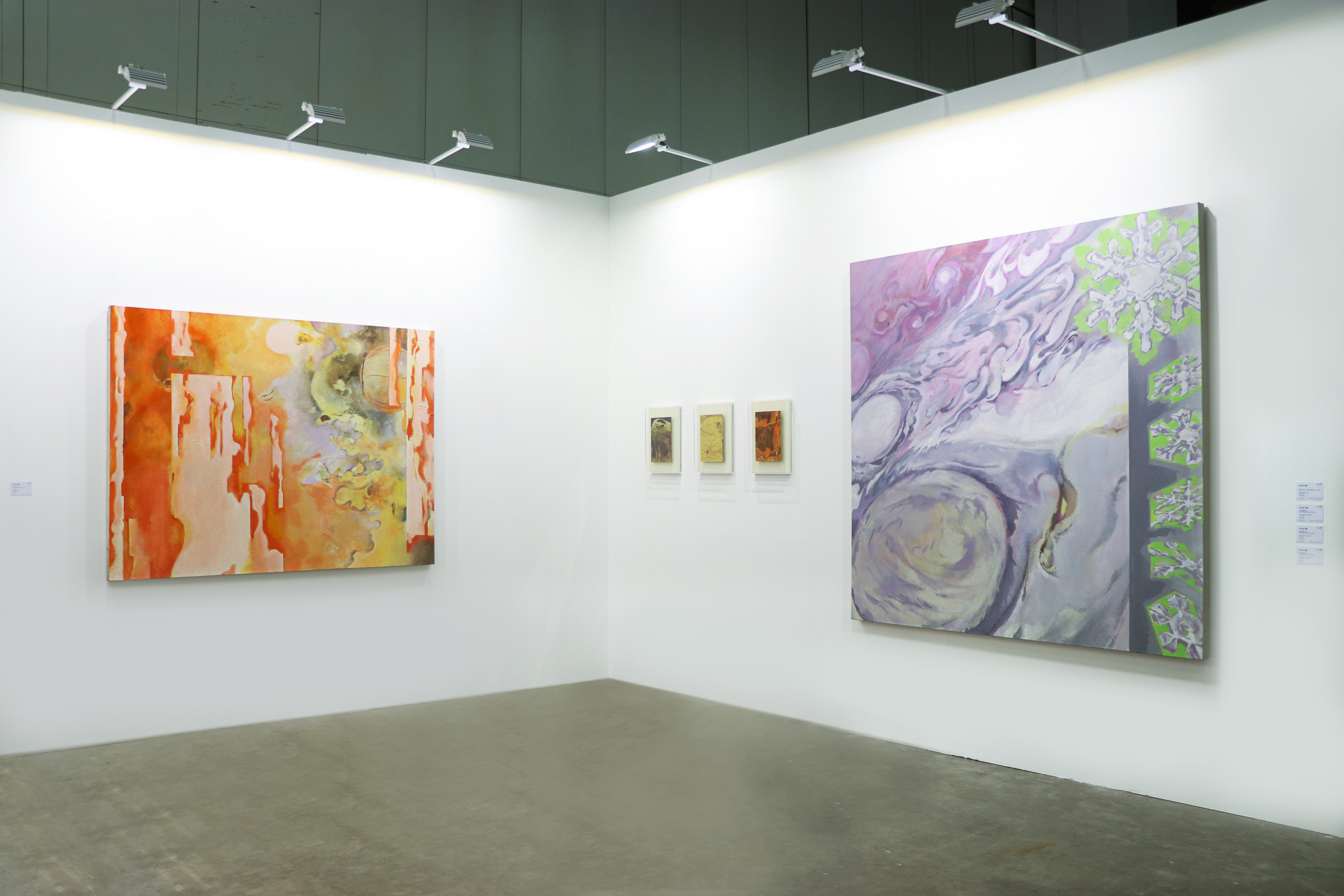 This series of works marks Jin Han's continued exploration of cosmic themes through profound personal perspectives, delving into the micro and macro dimensions. His pieces showcase organic forms invading the canvas, saturating and revealing textures. Flowing pigments seep into every corner, blending diverse motifs into a unified whole. The artist skillfully merges the macro with the micro, the figurative with the abstract, and positive with negative space, embodying his distinctive dual creative approach. By harmonizing rationality with sensibility and employing visual imagery generated by precision scientific instruments such as microscopes, telescopes, and meteorological satellites, he crafts vibrant nebula images that provoke contemplation on the poetic potential of science.